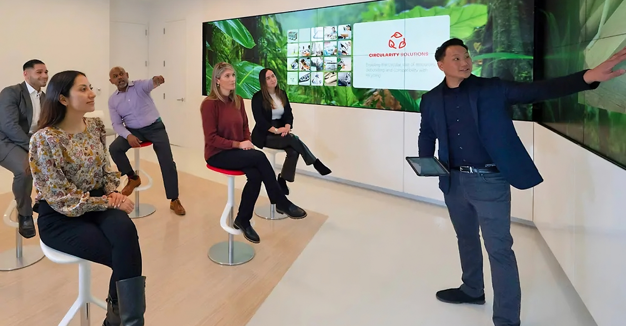 The interactive space at the Bridgewater Technology Center highlights how science and storytelling drive the company’s future solutions